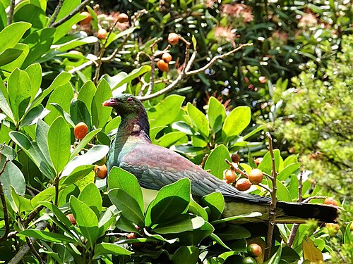 Karaka plays a key ecological role as a food source for native birds, particularly the kererū, which are among the few birds capable of swallowing and dispersing the large seeds. However, seedlings can establish prolifically, and in some regions it is considered locally invasive.